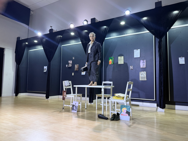 Inside a room with a table, three chairs and an old violin she sifts through documents, old pictures and artifacts. She dances, sings and tell stories -conjuring up fragmented narratives, voices, and characters that connect briefly, only to fade away into oblivion. Through research and memory, she combines real and imagined sites and events, blurring the lines between past and present and battling the gradual disappearance of memories. Especially in times of crisis the questions of memory and history and their